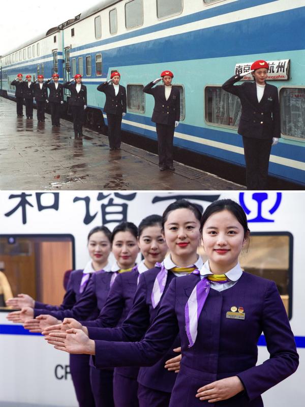 这是一张拼版照片,上图:1998年春运期间,南京铁路分局列车段客二队K1/6次的列车员以饱满的精神投入春运工作(新华社记者高梅及摄);下图: 2019年1月17日,南京客运段高铁二车队乘务员进行服务礼仪培训(苏阳摄)。