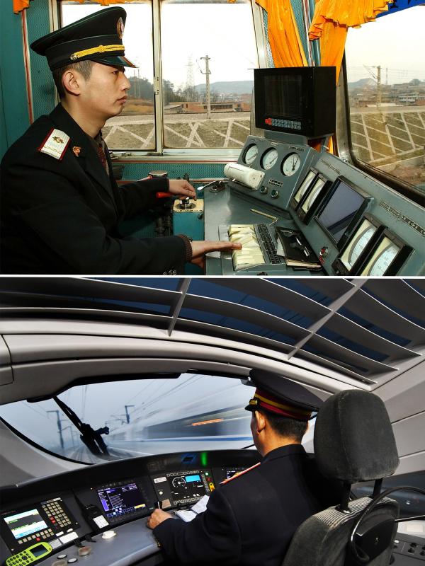 这是一张拼版照片,上图:2004年2月5日,贵阳铁路分局贵阳机务段司机张欣正在驾驶机车(新华社记者侯少华摄);下图: 2017年1月25日,高铁司机周立驾驶由北京南至天津的列车(杨宝森摄)。