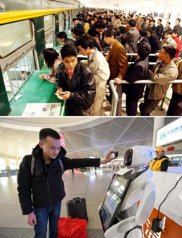 这是一张拼版照片,上图:2003年1月20日,旅客们在位于广州市黄沙大道的一家仓库中的临时售票处购买车票(新华社记者周文杰摄);下图:2019年1月22日,在呼和浩特火车东站,旅客将车票放在智能机器人面前扫码获取乘车信息(新华社记者彭源摄)。