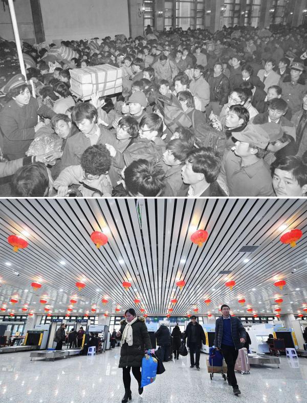 这是一张拼版照片,上图:1993年春运期间,旅客在北京火车站排队进站(新华社记者唐召明摄);下图: 2019年1月20日,旅客在改造后的兰州火车站进站乘车(新华社记者陈斌摄)。