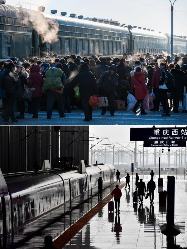 这是一张拼版照片,上图:2016年1月31日,在内蒙古呼伦贝尔根河火车站,当地群众乘车回家(新华社记者连振摄);下图:2018年2月12日,重庆西站的站台上,一列动车组准备发车(新华社记者刘潺摄)。