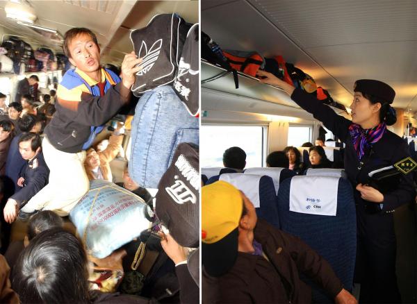 这是一张拼版照片,左图:2003年1月23日,在L28福州至重庆火车11号车厢里,刚上车的乘客在摆放行李(新华社记者姜克红摄);右图:2010年1月30日,武广高铁列车长姜飞在列车上检查乘客行李摆放安全(新华社记者李明放摄)。