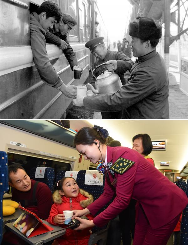 这是一张拼版照片,上图:1984年春运期间,在石家庄火车站,工作人员为过往旅客送开水(新华社记者赵连升摄);下图:2016年2月6日,南昌铁路局福州客运段列车工作人员廖辉为一名小乘客送去热水(新华社记者姜克红摄)。