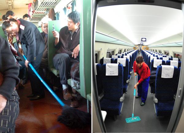 左图:2005年3月10日,一名乘务员在乌鲁木齐至喀什的列车上打扫卫生(新华社记者沙达提摄);右图:2011年2月10日,在武汉动车基地,一名清洁人员在清扫车厢(新华社记者程敏摄)。