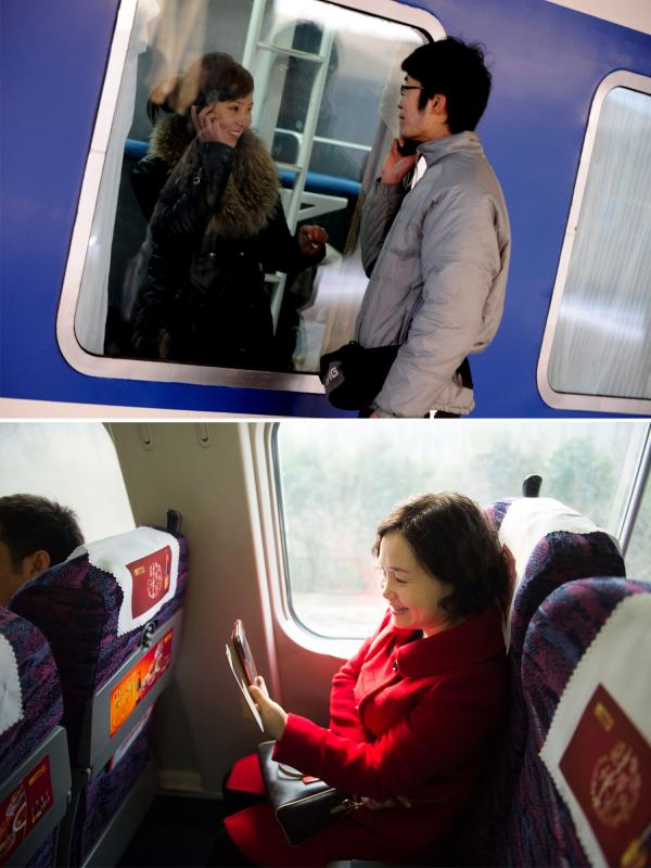 上图:2009年1月23日,在郑州火车站,一对情侣隔着车窗打电话道别(新华社记者朱祥摄);下图: 2015年2月4日,在合肥开往江山的高铁列车上,一位乘客在用4G网络与朋友视频聊天(新华社记者杜宇摄)。