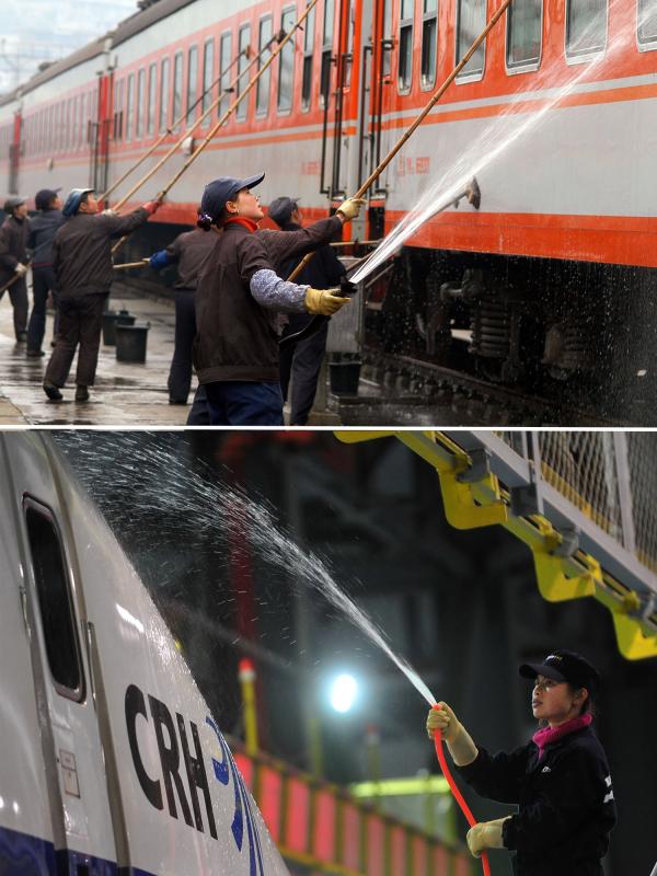 上图:2005年3月5日,贵阳火车站列车清洗组为列车清洁洗尘(吴东俊摄);下图:2011年2月10日, 武汉动车基地的清洁人员清洗动车组(新华社记者程敏摄)。