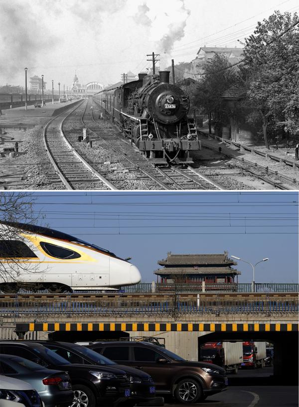 上图:1957年10月14日,北京-广州首次直达列车从北京车站开出(新华社记者孟庆彪摄);下图:2019年1月25日,一列复兴号动车组列车在北京永定门城楼附近的京津城际铁路上行驶(新华社记者邢广利摄)。