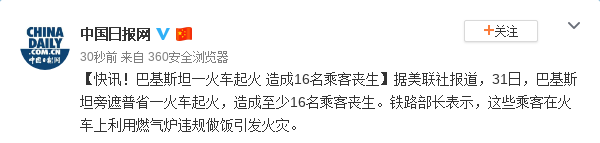 巴基斯坦一火车起火 造成16名乘客丧生