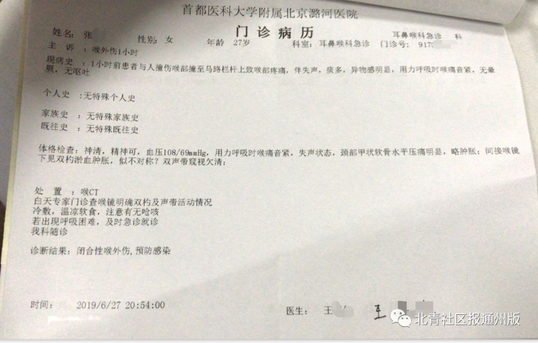 “刚开始医生说因为软骨骨折后有错位,情况严重的话有可能需要做切开气管的手术,”纪先生回忆说,刚入院的前两天,张女士总是喘不上来气,也没办法说话,后来还去同仁医院做过检查。