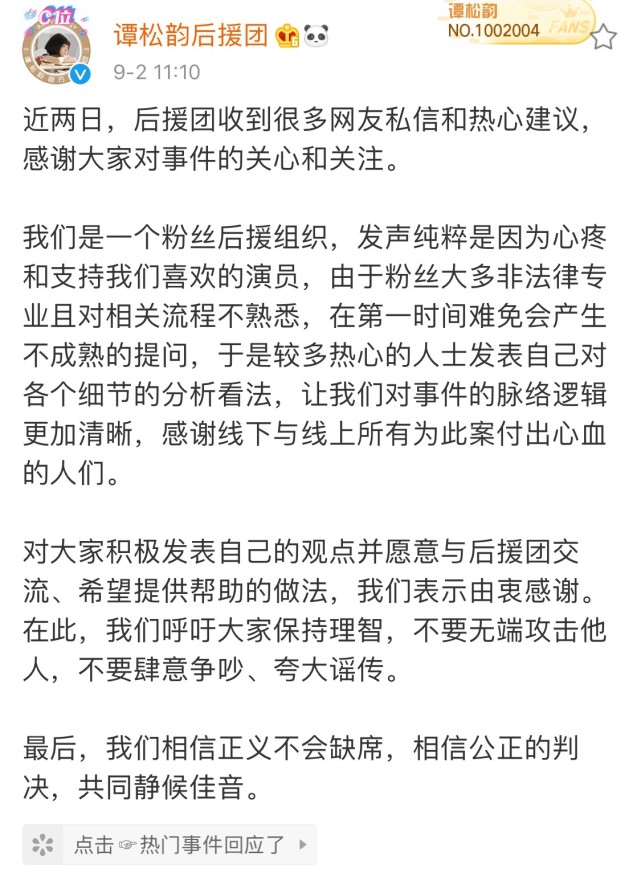 @谭松韵后援团 发微博质疑物证丢失、KTV与行车记录仪的视频记录消失等问题,作为官方粉丝组织非但不能正向引导粉丝以理性客观的态度支持明星,反而发布有悖事实煽动情绪的内容,扰乱社区秩序,鉴于其随后主动删除了有关内容并作了声明,从轻处罚禁言三个月。