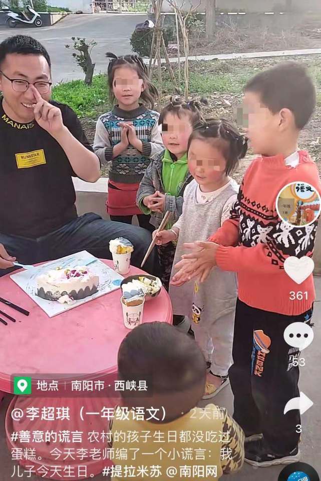 近日,一段视频在网上感动了不少网友,视频中,几名小朋友围着一个粉色的小饭桌分着蛋糕一起唱生日快乐歌,祝着“生日快乐”。发布这段视频的是河南南阳西峡县重阳镇芦沟小学一年级的李超琪老师,她配文说“农村的孩子生日都没吃过蛋糕,今天李老师编了一个一个小谎言:我儿子今天生日”。不少网友看到这个视频为李老师点赞,还有网友要给这个小女孩捐钱,甚至有网友想每年生日都给这个小女孩定个蛋糕。