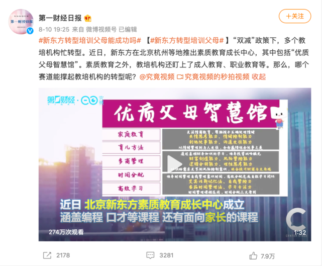 据《第一财经日报》报道,近日,新东方在北京、杭州等地推出素质教育成长中心,其中包括“优质父母智慧馆”。素质教育之外,教培机构还盯上了成人教育、职业教育等。