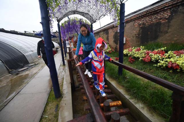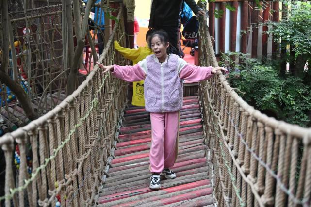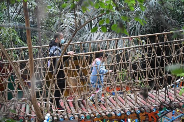 “牡帕密帕是源于拉祜族诞生传说的故事,取自于拉祜语,意为:造天造地造万物的含义!热带雨林里的生物多种多样,咱们看看吊桥的尽头有什么。”在三米多高的吊桥头,一位女士拉着孩子,一边走一边给孩子读出指示牌上的文字。小朋友们紧抓木吊桥两边的绳索,从桥的一端走到另一端。吊桥则随着急促的步伐,左右摇晃,为了保持平衡,小朋友们“步步为营”向前挪移。
