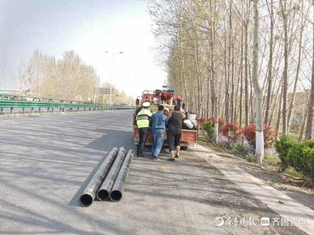 原来,当天上午九点左右,东阿交警大队大桥中队巡逻民警像往常一样在辖区开展清明节期间路面安全巡逻。当行至省道324陈集附近时,发现路面洒落了很多水管,两名人员正在吃力的搬运,不但自身存在很大危险,也严重影响车辆通行,存在极大的安全隐患。