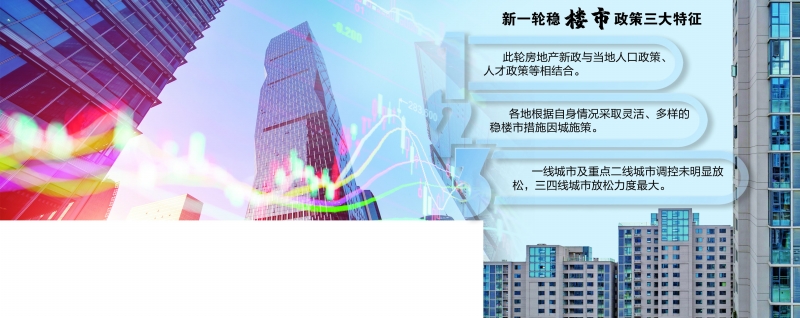 证券时报记者梳理发现,此轮房地产新政呈现三大新特征:第一,此轮房地产新政不再单纯为刺激购房需求,而是与当地人口政策、人才政策等相结合,寄望一举多得,如武汉、杭州、东莞、泸州、常州、沈阳等地最新房产政策;第二,此轮购房政策不再全国相对统一,而是各地拥有了更多自主权,它们均根据自身情况采取灵活、多样的稳楼市措施因城施策,如长沙、杭州、沈阳、德州、日照、连云港、惠州等;第三,北上广深等一线城市及全国少数重点二线城市调控仍未明显放松,三四线城市放松力度最大,不同城市间购房政策差距拉大。