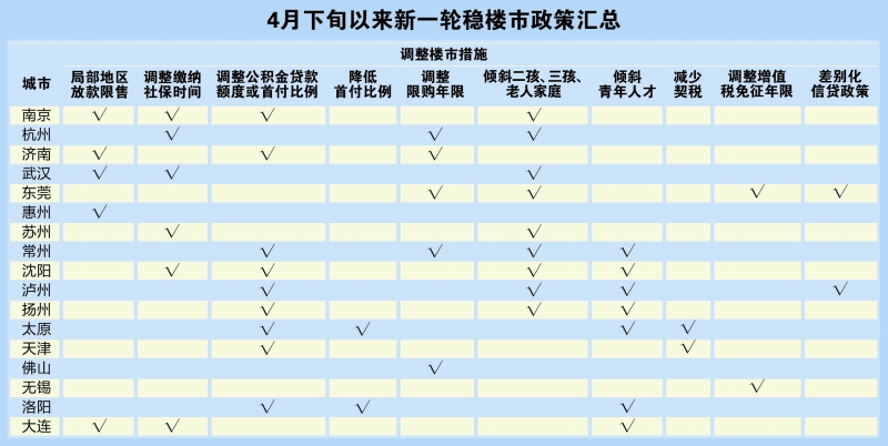 天津、东莞、惠州、佛山、杭州、苏州、武汉、济南等一批热点城市也已根据自身情况推出了“自选动作”。天津将购买家庭首套住房的公积金贷款最高限额由60万元上调至80万元;东莞将个人住房转让增值税征免年限由5年调整为2年,商品住房取得不动产权证满2年的可以进行交易转让;惠州取消惠阳区、大亚湾区限购;佛山满5年二手房不占购房名额,交易也不限购;杭州新政规定,落户未满5年在限购范围买二手房取消社保要求,非本市户籍家庭连续缴纳社保或个税满12个月即可购房,降低二手房限购门槛;苏州一手房限售3年调整为2年,二手房限售全面取消。