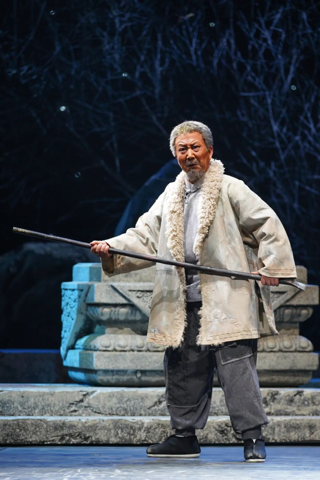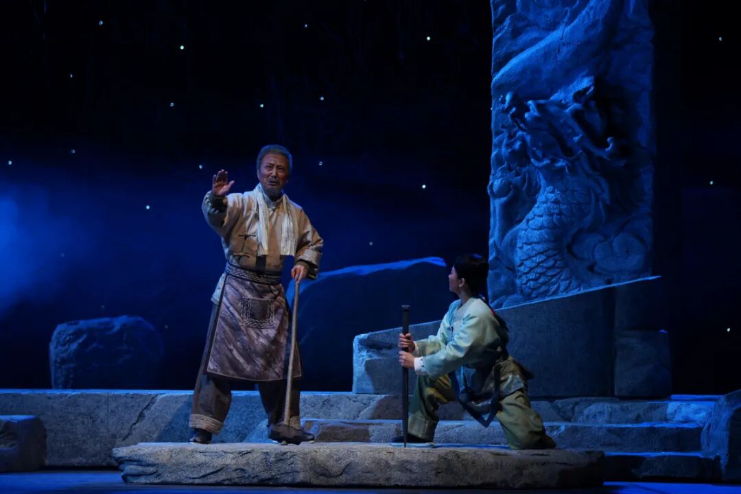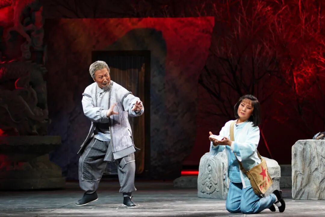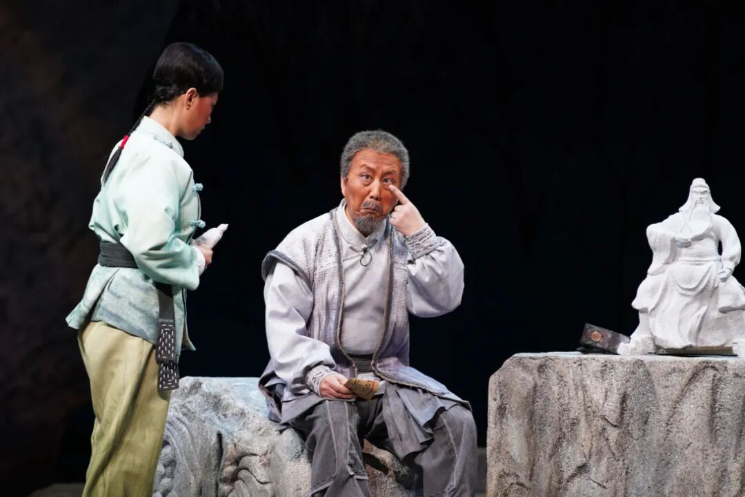 从序幕中走出来一个石匠群体,他们每个人都有自己的手艺,都有自己的故事。主演王英会也就是主人公石老爹,满面沧桑,紧锁的眉头,传神的眼神,仿佛有许多情绪要倾诉,这也预示出全剧的悲情主色调。及至戏剧矛盾频发,人物的情感冲决也就顺势而来。儿媳也就是军代表玉琴,终于忍不住说出石富牺牲的秘密,石老爹在沉思中儿子儿媳来到身边,石老爹思儿心切,要去找一块上好的石料为儿子竖一块碑,玉琴也牺牲了,石老爹孤苦伶仃地去北京雕刻人民英雄纪念碑……一幕幕场景移动变幻,一声声悲声大放,这真是催泪弹啊!我们这凡胎肉躯,怎能不为这样的情感潸然泪下?