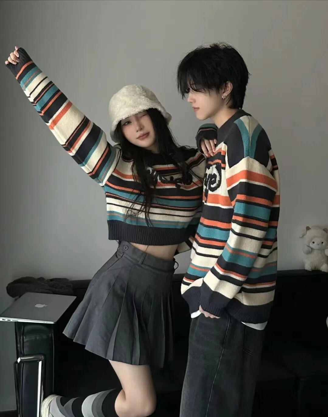 第一套情侣穿搭,彩色条纹情侣装,女生短款搭配灰色百褶裙,青春活力,男生搭配同色系裤子,即使男女同款也能穿出不一样的时尚感,彩色条纹的撞色搭配恰到好处,橙色的点缀很好地提亮了衣服。