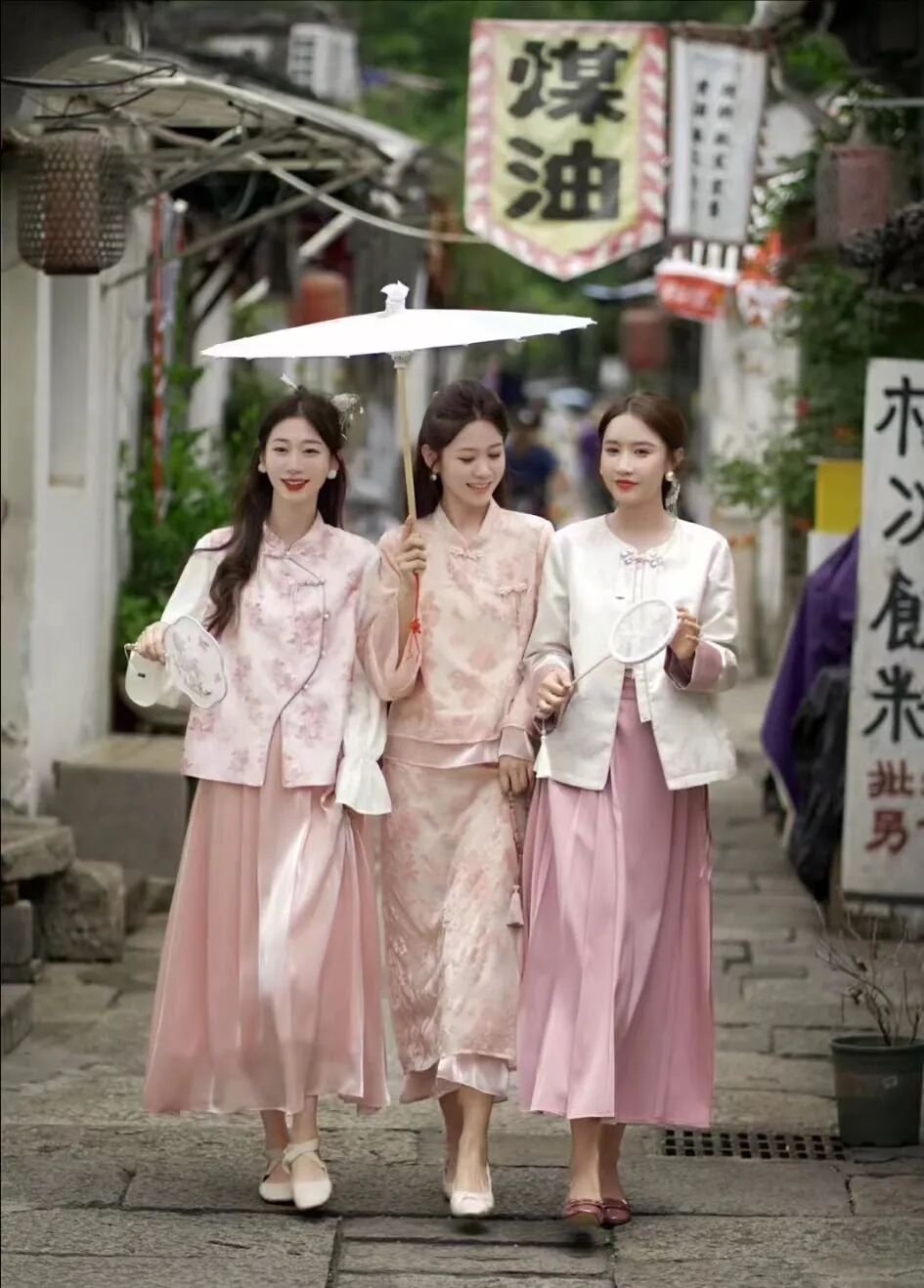 第四套闺蜜穿搭,怎么能不和闺蜜一起下江南呢?近两年新中式服饰的火爆程度有目共睹,我们的文化自信、服饰自信日益提高,穿上中国风服装和好姐妹一起去一趟真江南,吹吹河边温柔的风,走过带着青苔的石板路。一同穿一套粉色系的新中式套装,每一件都美的独特,走在一起就是“CP感”。