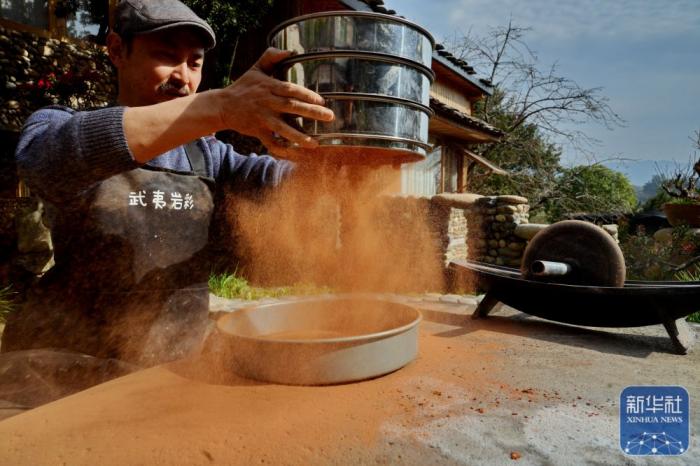 武夷岩彩画师胡磊将采集回的岩土碾碎研磨成粉