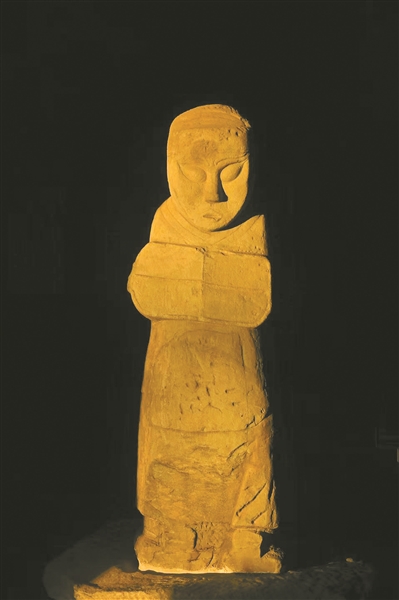 每年冬至清晨,阳光越过城市的屋脊,像被精心裁剪的金绸,从西展厅的门窗溜入。先是极细的一缕,轻吻上石人的头顶,好似怕惊扰了它千年的沉梦;转瞬便舒展身姿,缓缓流淌、蔓延,一寸寸拂过发冠纹路、衣袂褶皱、盾牌边缘,直至整尊石像都被裹进璀璨的金辉中,最后变成一尊“金人”。