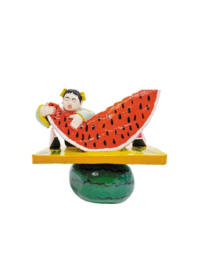 这些小玩意儿的泥土气息总是提醒观众,它们和土地、生活、仪式有关。那些船模样的绣花鞋、建筑木料改制的俑像、贝壳拼合的情侣,提示我们,人类在很长的时间里总是倾向于将自然和世界“俑像化”。