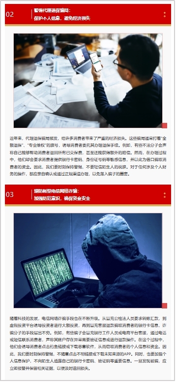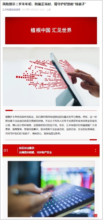 活动期间,我公司通过官方微信公众号“汇丰财富规划服务”发布了多篇关于防范非法金融活动的知识科普与风险提示文章,如《风险提示|岁末年初,防骗正当时,请守护好您的“钱袋子”》、《岁末金融防护指南|防范非法金融活动,守护钱袋子,过好幸福年》等文章。这些举措旨在通过线上渠道扩大金融知识教育宣传的影响力,助力消费者提升金融素养,增强对非法集资、网络电信诈骗等非法金融活动的警惕性。同时,公司致力于通过多样化的宣传方式,更广泛地向公众普及非法金融活动的危害知识,进一步加深防范非法金融活动宣传的广度和深度。