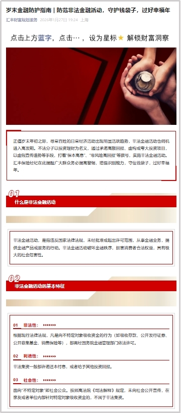 岁末年初是“万家团聚、万众返乡”之际,也是防范非法金融活动的关键窗口期,我司针对这一特点,“精准滴灌”与“全面覆盖”,通过线上宣传方式扩大宣传范围和影响力,切实筑牢"全民防非、主动拒非"的思想防线,以宣传教育实效守护好人民群众的"钱袋子",为维护金融市场秩序和社会大局稳定奠定坚实基础。