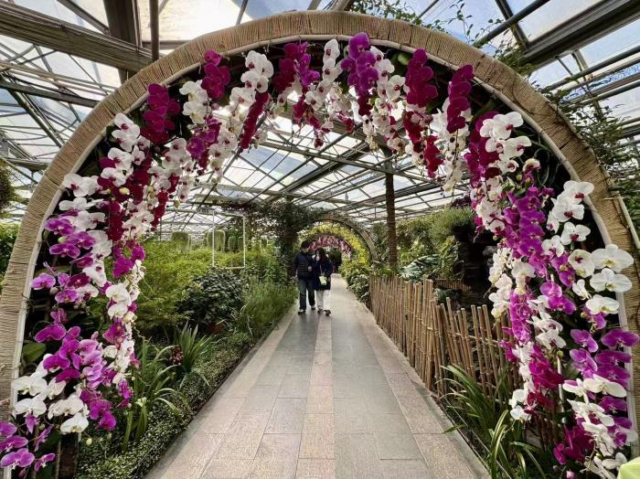 热带植物馆的蝴蝶兰立体花瀑更是吸睛,粉紫白三色蝴蝶兰沿高处垂落,蝴蝶造型点缀其间,阳光透过阔叶林缝隙洒落,营造出如童话森林般的唯美意境,成为游客拍照打卡的热门点位。