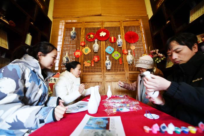 一些家庭在共同绘制陶坯梅瓶,感受泥土与釉彩交融的传统工艺。