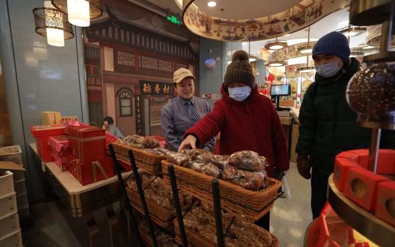 “给我来一份同款!”2月11日,位于隆福寺街区的北京稻香村零号寻宝馆内依旧人气爆棚,不少顾客专程前来打卡,点名要买总书记同款年货“三件套”——蜜三刀、奶油麻花和开花枣。