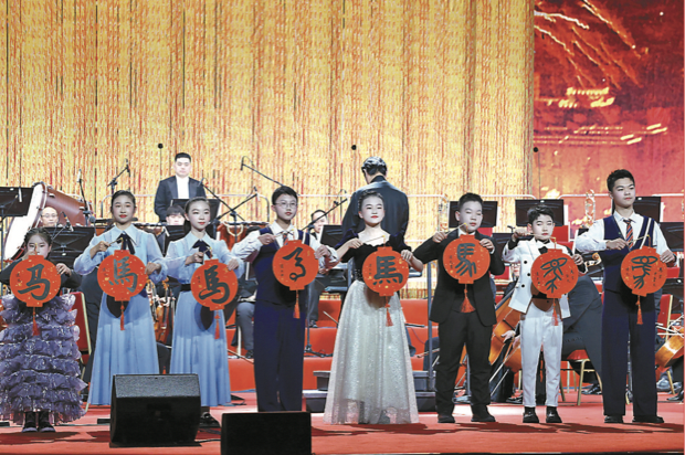 北京新春音乐会上,小演员们在台上展示不同字体的“马”字