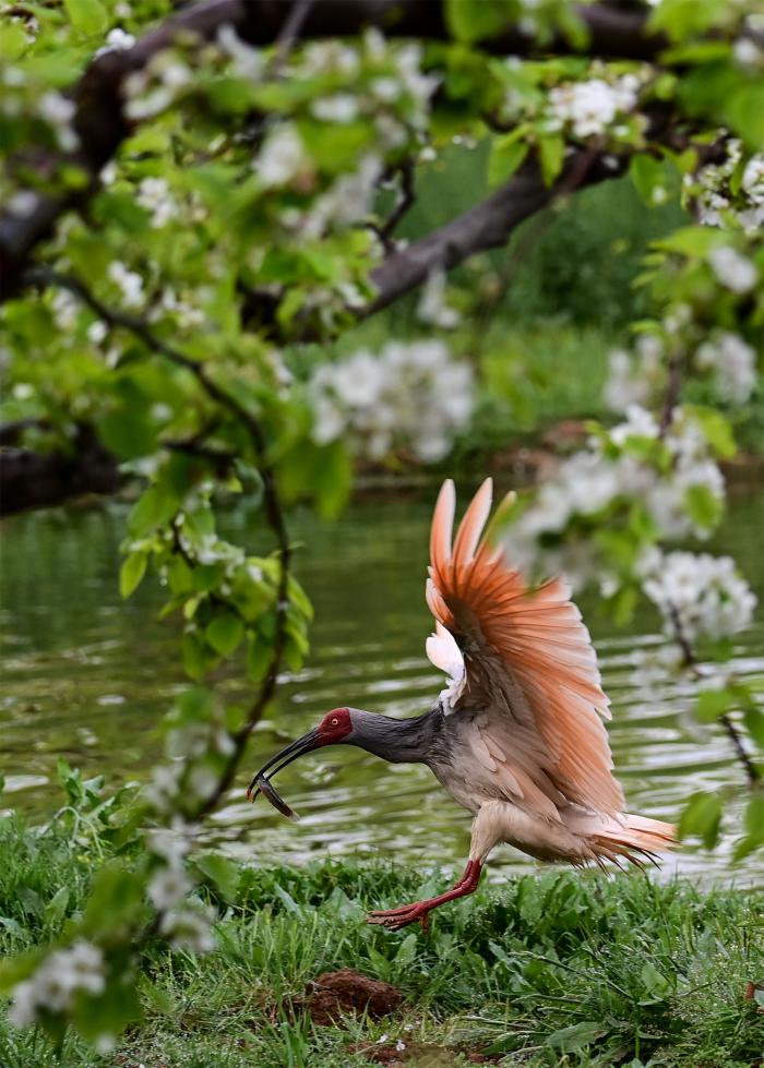 3月30日,朱鹮从洋县草坝村的梨树上方飞过。
