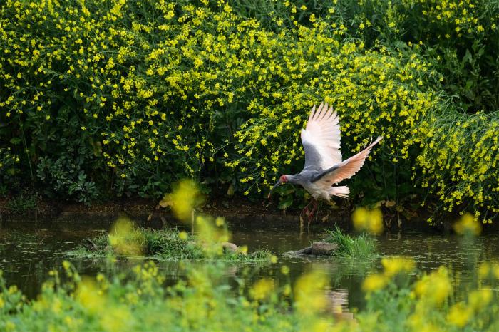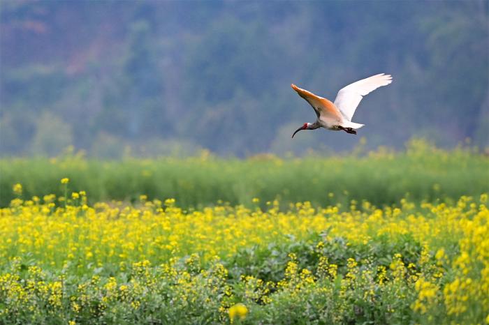 3月29日,朱鹮飞过洋县草坝村的油菜花田。