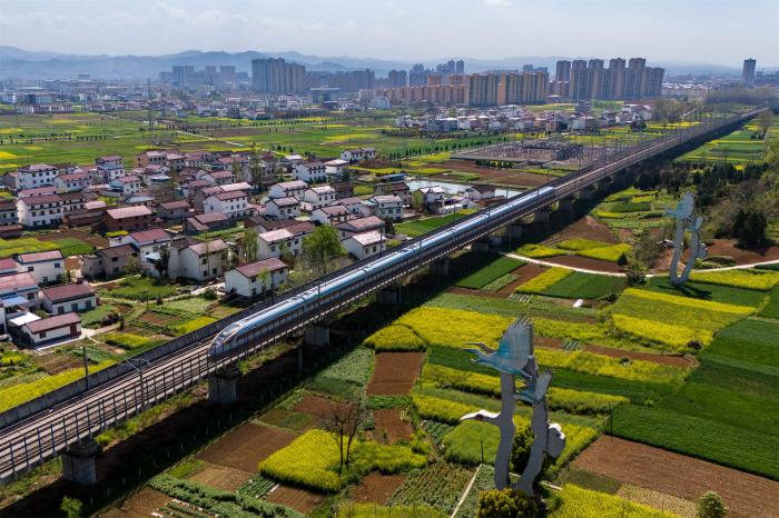 高铁列车驶过洋县洋州街道何家村附近的朱鹮雕塑(3月31日摄,无人机照片)。