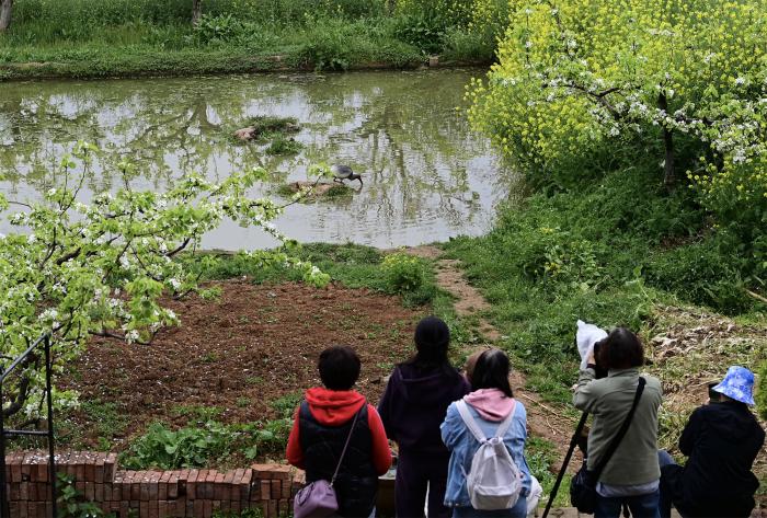 3月29日,观鸟爱好者在洋县草坝村的一处水塘边观看朱鹮觅食。