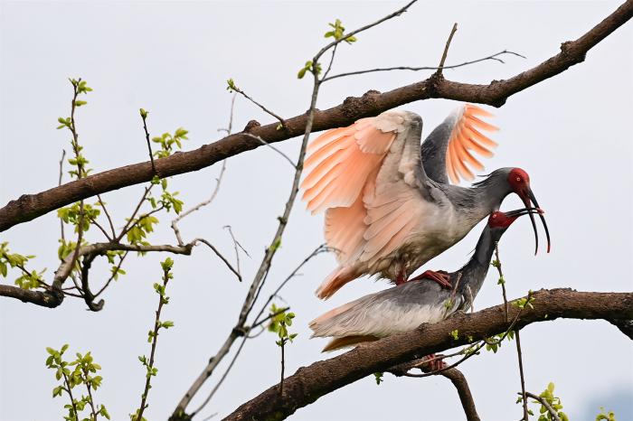 3月30日,洋县草坝村,一对朱鹮夫妇在枝头“踩背”。