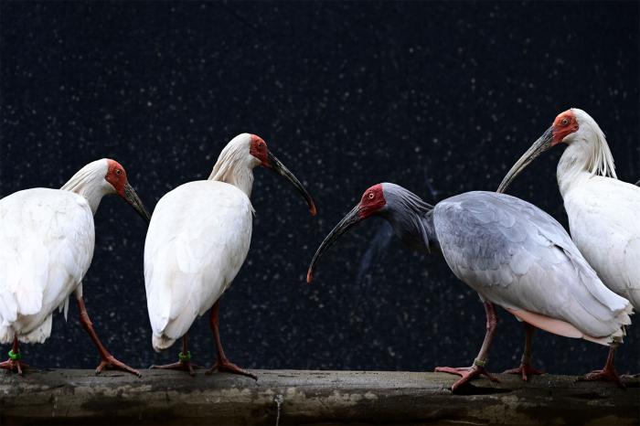 3月30日,陕西汉中朱鹮国家级自然保护区朱鹮人工繁育中心的饲养员为朱鹮投喂泥鳅。