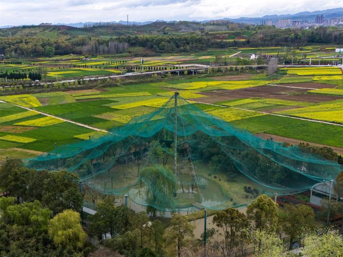 陕西汉中朱鹮国家级自然保护区朱鹮人工繁育中心的朱鹮野化放飞训练网笼(3月30日摄,无人机照片)。