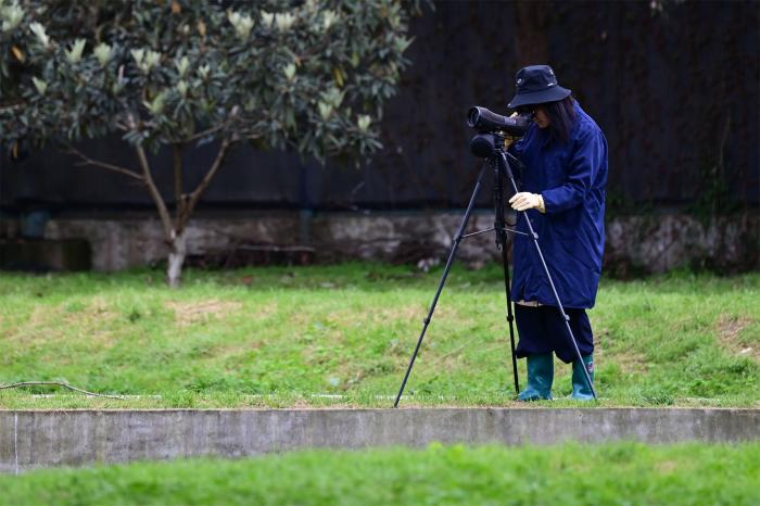 3月30日,在陕西汉中朱鹮国家级自然保护区朱鹮人工繁育中心,饲养员在观测朱鹮产卵情况。