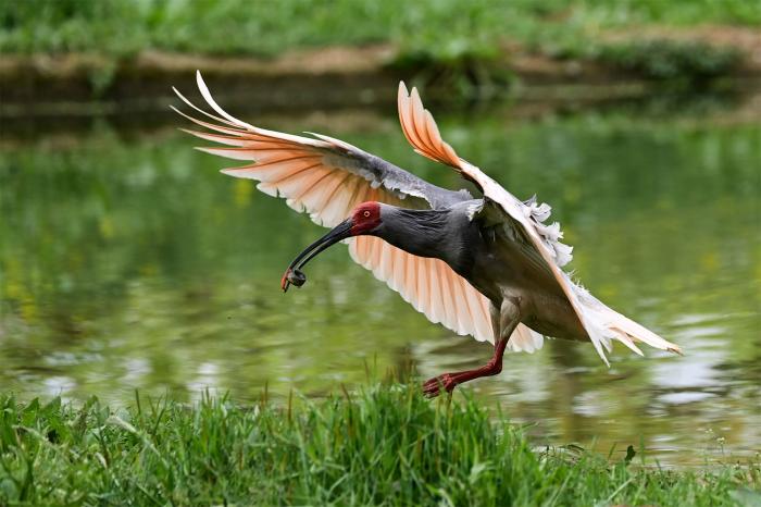 45年来,通过栖息地修复、人工繁育、全民参与相结合的实践路径,洋县朱鹮保护与种群发展成效显著,当地生态环境持续改善,形成人鸟相伴、人与自然和谐共生的诗意画卷。图为3月30日,朱鹮在洋县草坝村的一处水塘觅食。