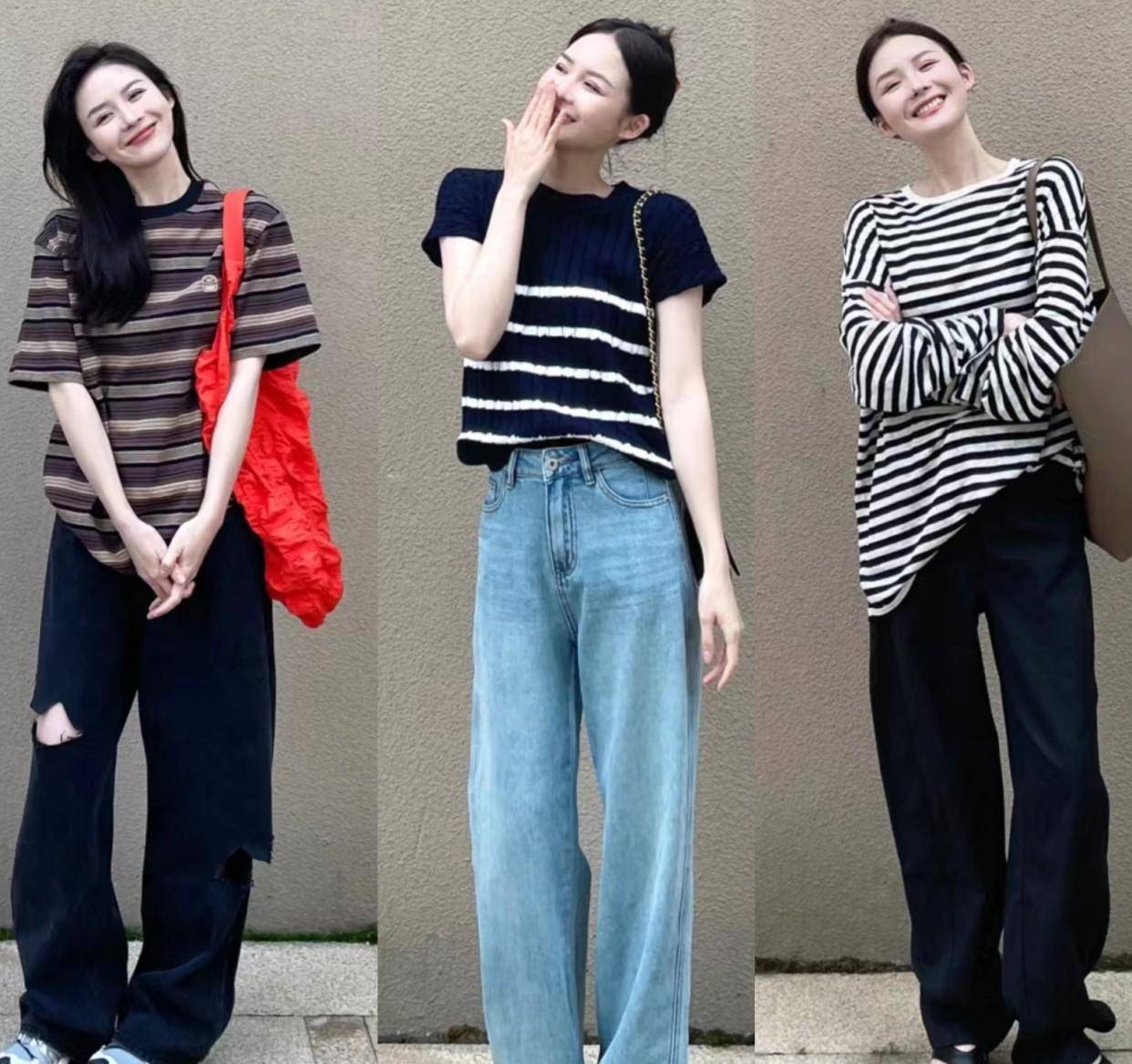 水蓝色的条纹衬衫显白效果很好,宽松的版型更好看。搭配简单的牛仔裤,很容易导出青春活力,非常时尚。
