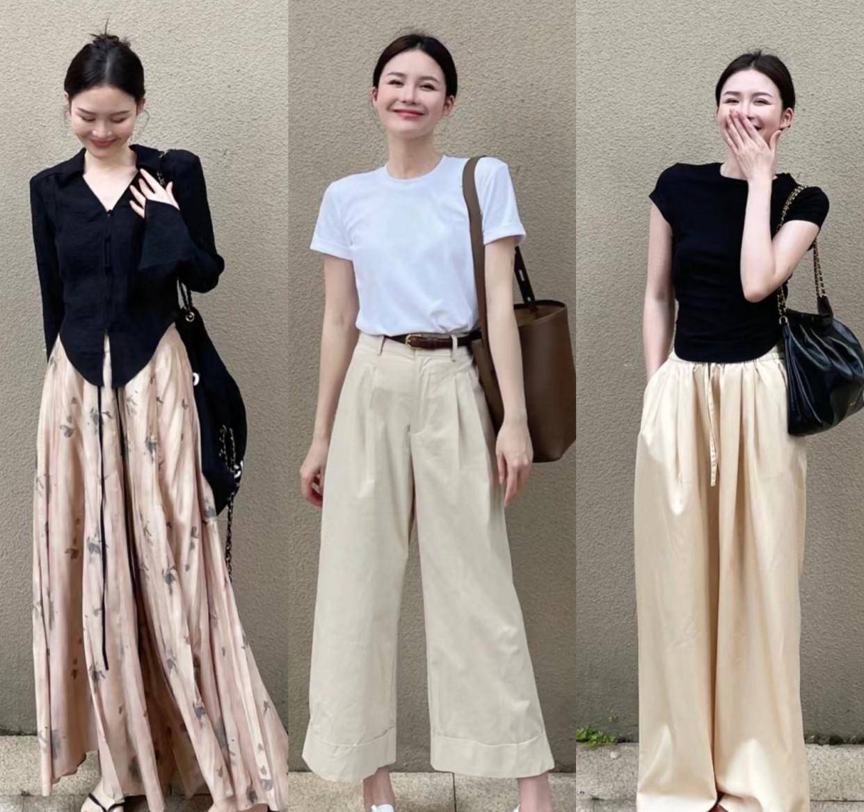 如果你是小女生或者微胖女生,又想显瘦显大,我们可以选择垂感好的阔腿裤,长度要盖过脚,分分钟就能穿出大长腿。