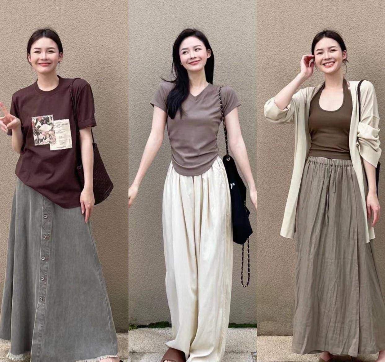 咖啡色的T恤,比较洋气的颜色,搭配怀旧的牛仔裙,简约舒适的配色,减龄又时尚。卡其色廓形衬衫,内搭咖啡色背心,经典大地色搭配。同色系看起来很协调,很有质感。