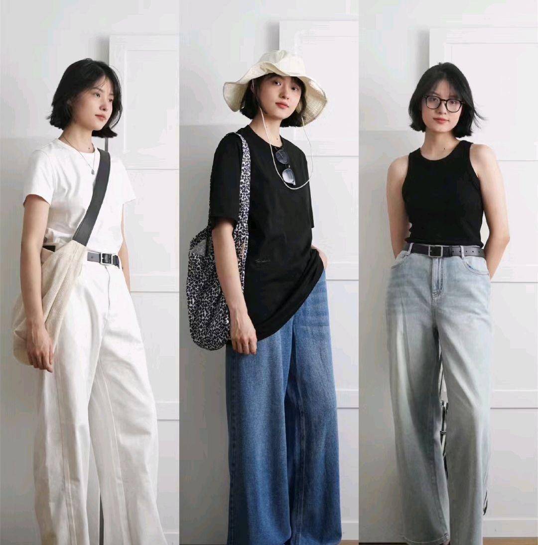 我喜欢简单的T恤搭配牛仔阔腿裤。可以选择怀旧的阔腿裤,有一种简单自然的美感,充满青春气息。它们营造出一种休闲舒适的基调,非常时尚。
