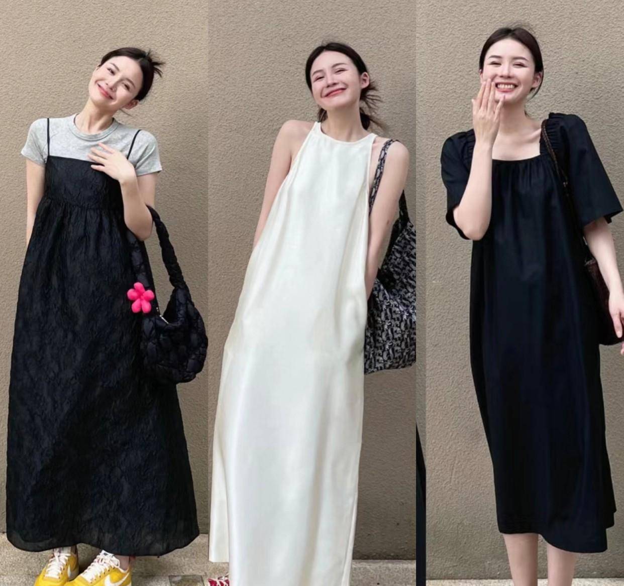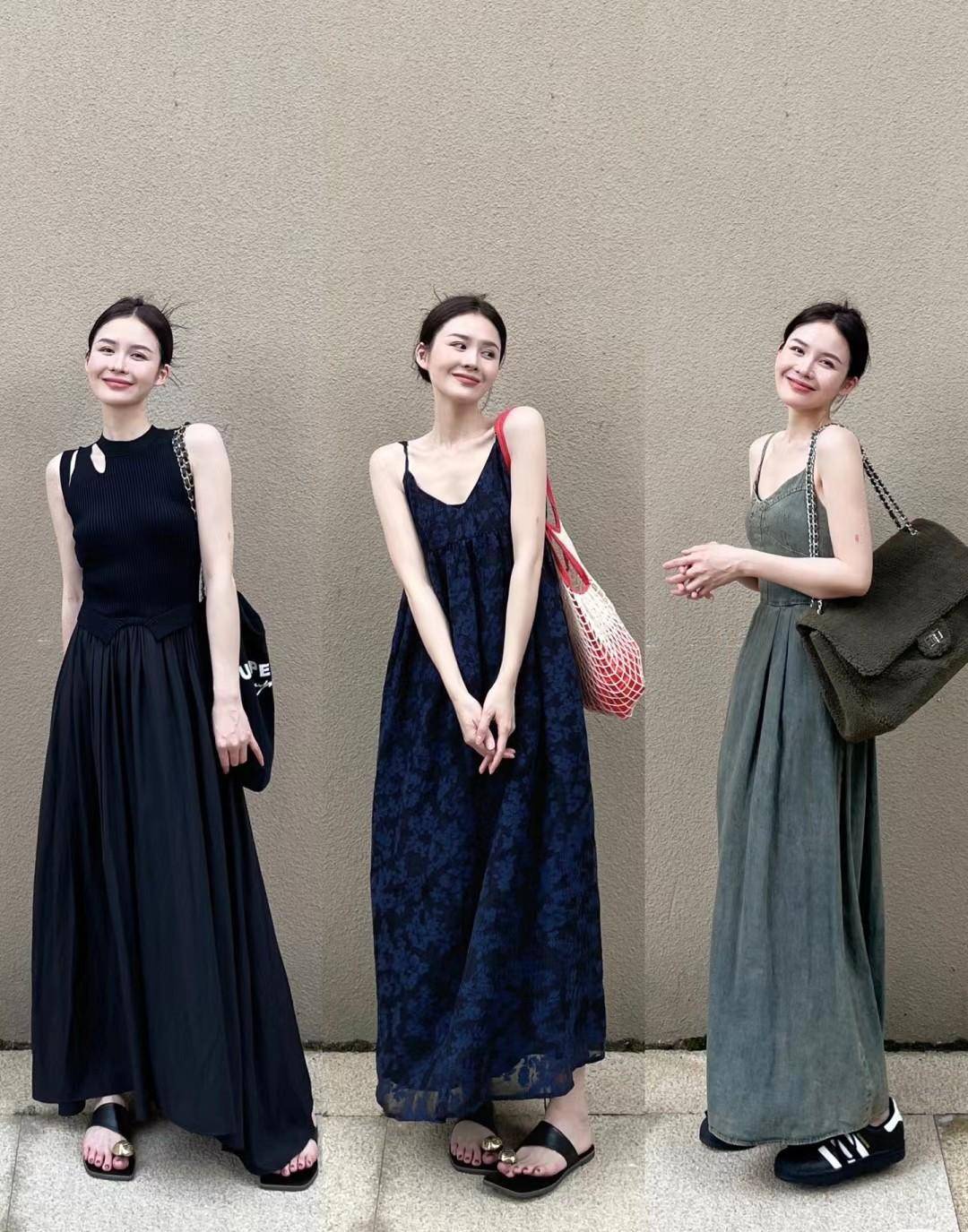 夏天可以选择吊带连衣裙。经典的黑、白、灰都可以,轻松穿出高级感。黑色的吊带连衣裙,简单又温柔,显出慵懒的气息,非常文艺,特别适合度假出行。