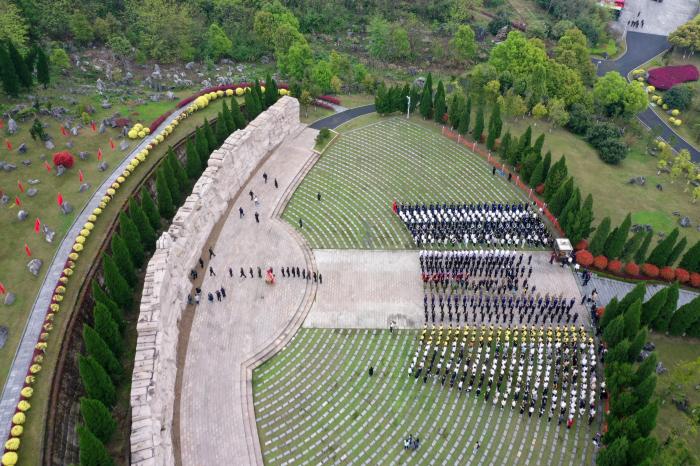 1934年底,为确保中共中央和中央红军主力渡过湘江,粉碎敌人围歼红军于湘江以东的企图,几万名红军将士血染湘江两岸。湘江战役结束后,中央红军从长征开始时的8.6万人减至3万余人,无数英烈埋骨桂北大地。4月2日,在广西全州县红军长征湘江战役纪念园凭吊广场,人们在祭奠红军英烈(无人机照片)。