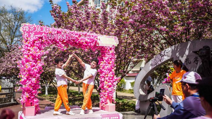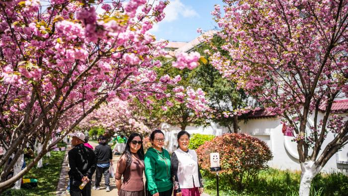 文旅消费联动视听、商超、餐饮等领域,成为激活市场消费潜力新的经济增长点。4月3日,游客在六盘水市钟山区水城河畔樱花长廊拍照留念。