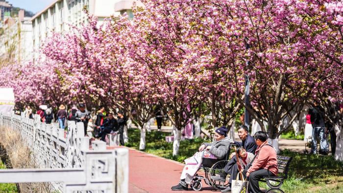 4月3日,市民在六盘水市钟山区水城河畔樱花长廊休憩。