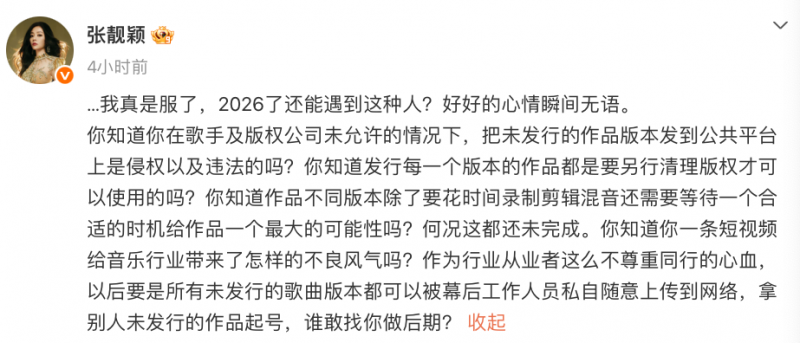 张靓颖在微博中直指涉事人员“不尊重同行心血,拿别人未发行作品起号”,并质问“谁敢找你做后期?”。张靓颖工作室声明称,该账号擅自发布的为艺人未完成、未发行的音乐作品版本,严重侵害了公司及艺人的合法权益。